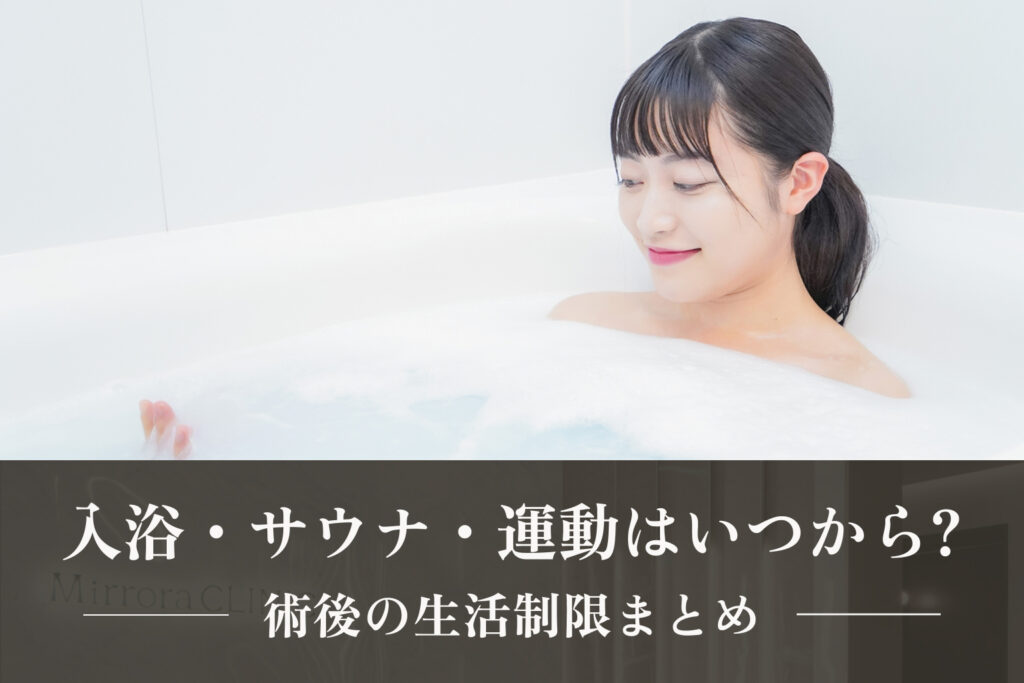 入浴(湯船に浸かること)について 湯船に浸かる入浴は、血行を過度に促進し、腫れや内出血を悪化させる可能性があるため、術後1週間は控えてください。