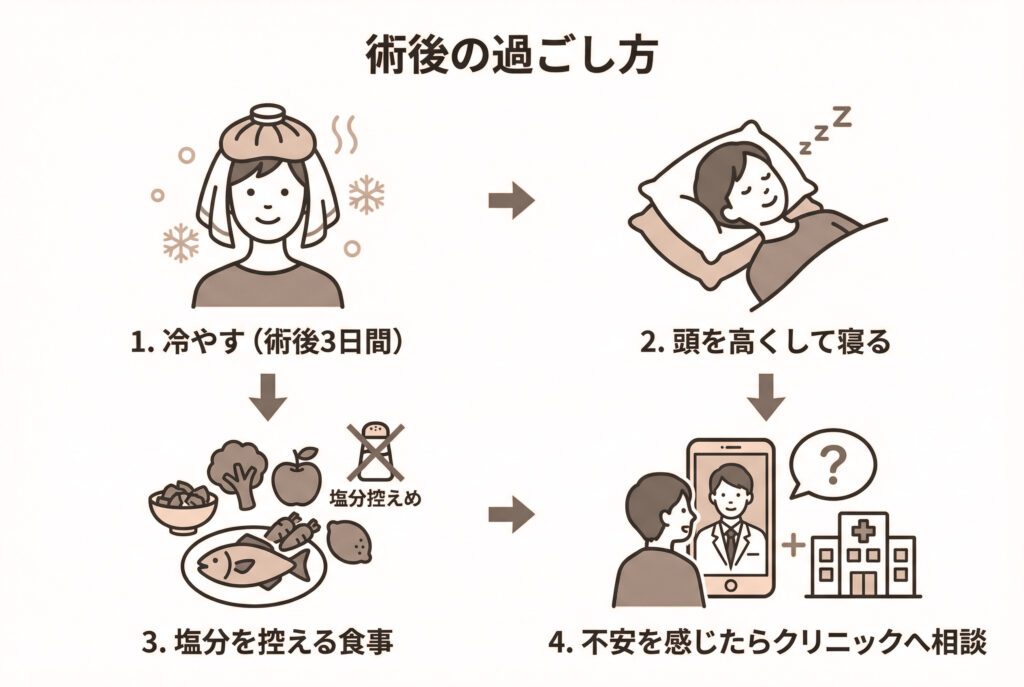 手術後の腫れや内出血は、体の正常な防御反応であり、術後1日から3日目にピークを迎えるのが一般的です。 この期間は、患部を適切に冷やす「冷却療法」が非常に効果的です。