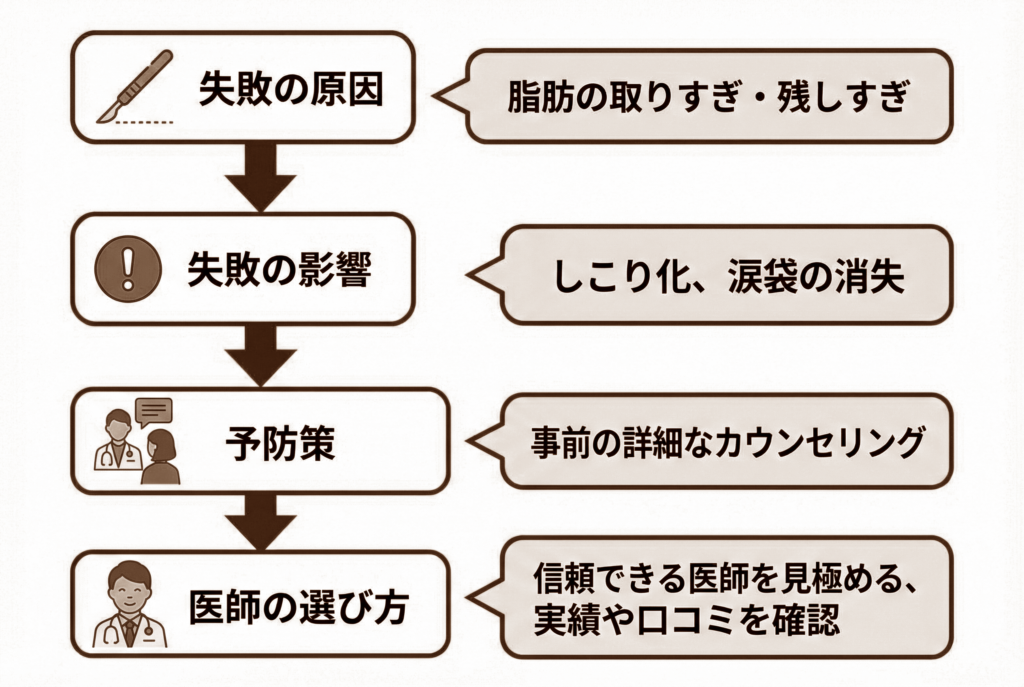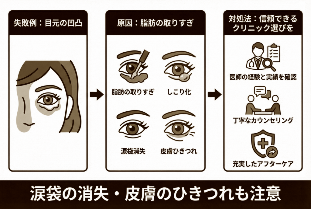 クマ取りにおける失敗例として、目の下の脂肪(眼窩脂肪)の量に関する問題が挙げられます。 これは、術前の診断精度と、執刀する医師の技術に大きく左右される部分です。