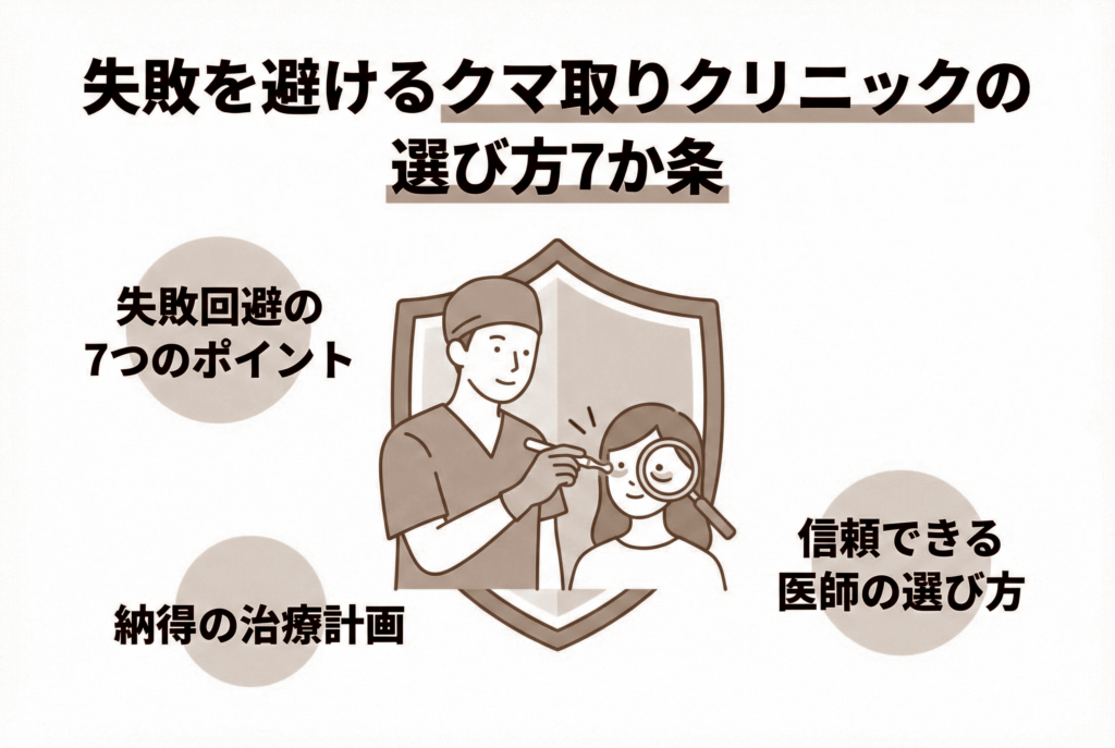 今回は、クマ取りの失敗例と、それを避けるための具体的なクリニック選びのポイントについて詳しく解説しました。