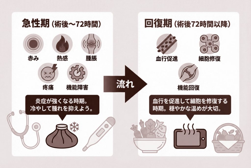 血流は、傷ついた組織に修復のための酸素や栄養を届け、老廃物を運び去る重要なライフラインです。 ただし、手術後の血流管理は時期に応じたメリハリが大切です。 過度な血行促進は、かえって腫れや内出血を悪化させるため注意が必要です。