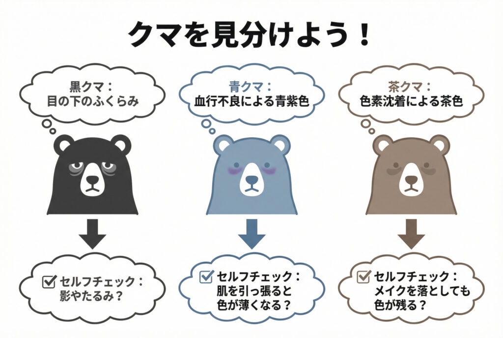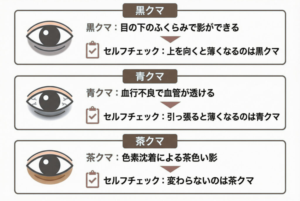 ここでは、クマの主な種類である「黒クマ」「青クマ」「茶クマ」について、それぞれの原因と、ご自身で簡単に見分けられるセルフチェック方法を、医師の視点から詳しく解説します。
