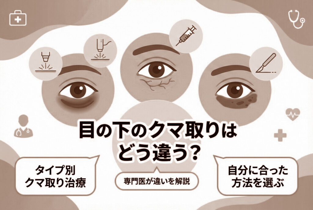 ご自身のクマの種類を正しく理解し、原因に合った治療を選ぶことが重要です。 ここでは「黒クマ」「青クマ」「茶クマ」それぞれに適した治療法の特徴や、医師がどのように治療法を選択するのかを詳しく解説します。
