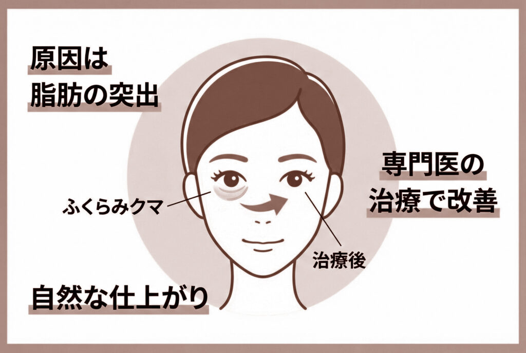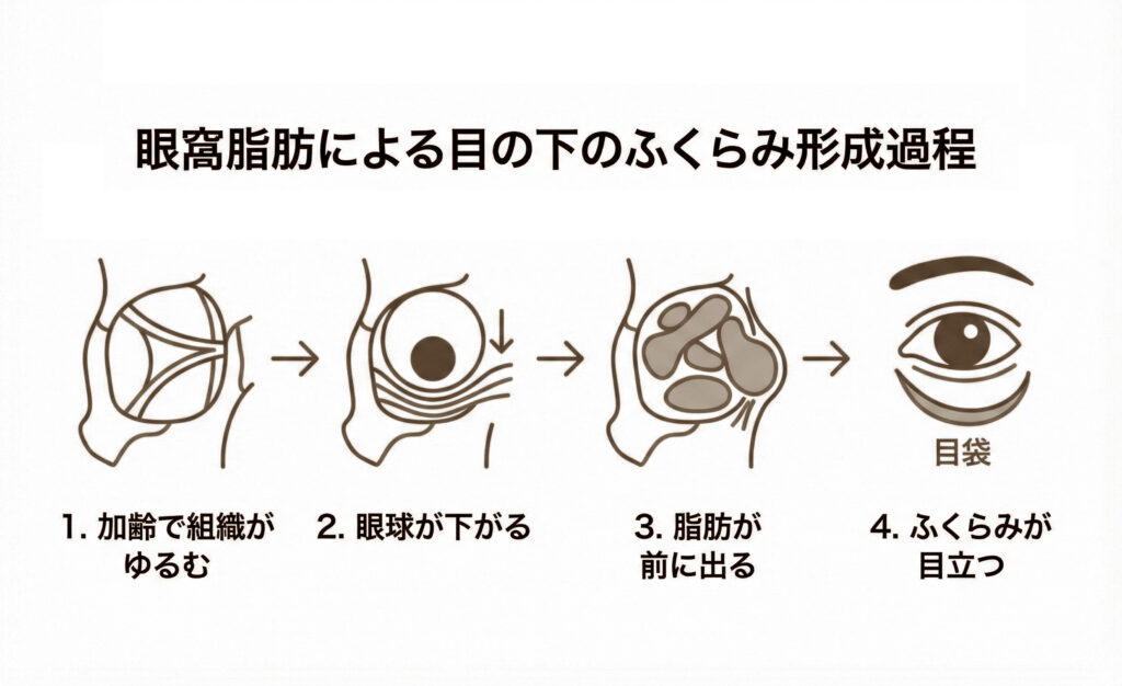さらに、脂肪を押さえている眼窩隔膜もゆるんでいると、押し出された脂肪を支えきれなくなります。その結果、脂肪が皮膚の表面にまで押し出され、ふくらみとして目立つようになるのです。