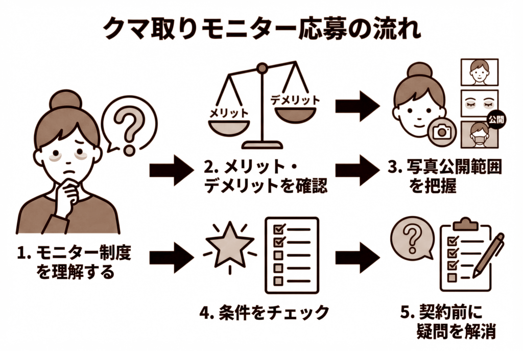 クマ取りモニターとは、施術を受ける方がクリニックの広報活動に協力する代わりに、割引価格で施術を受けられる制度です。